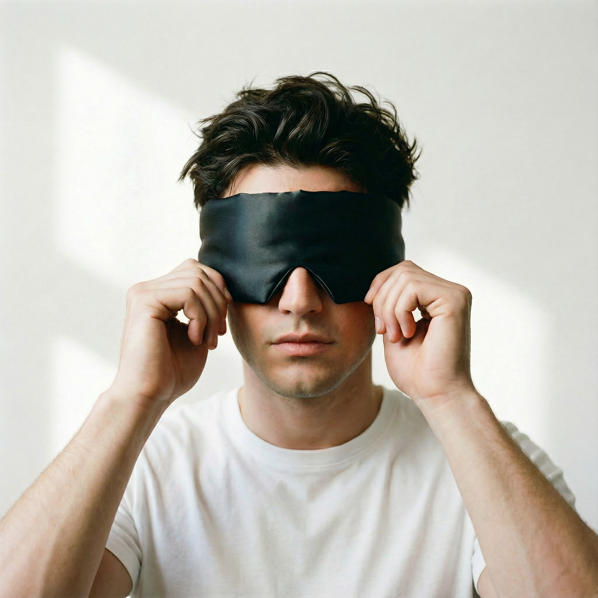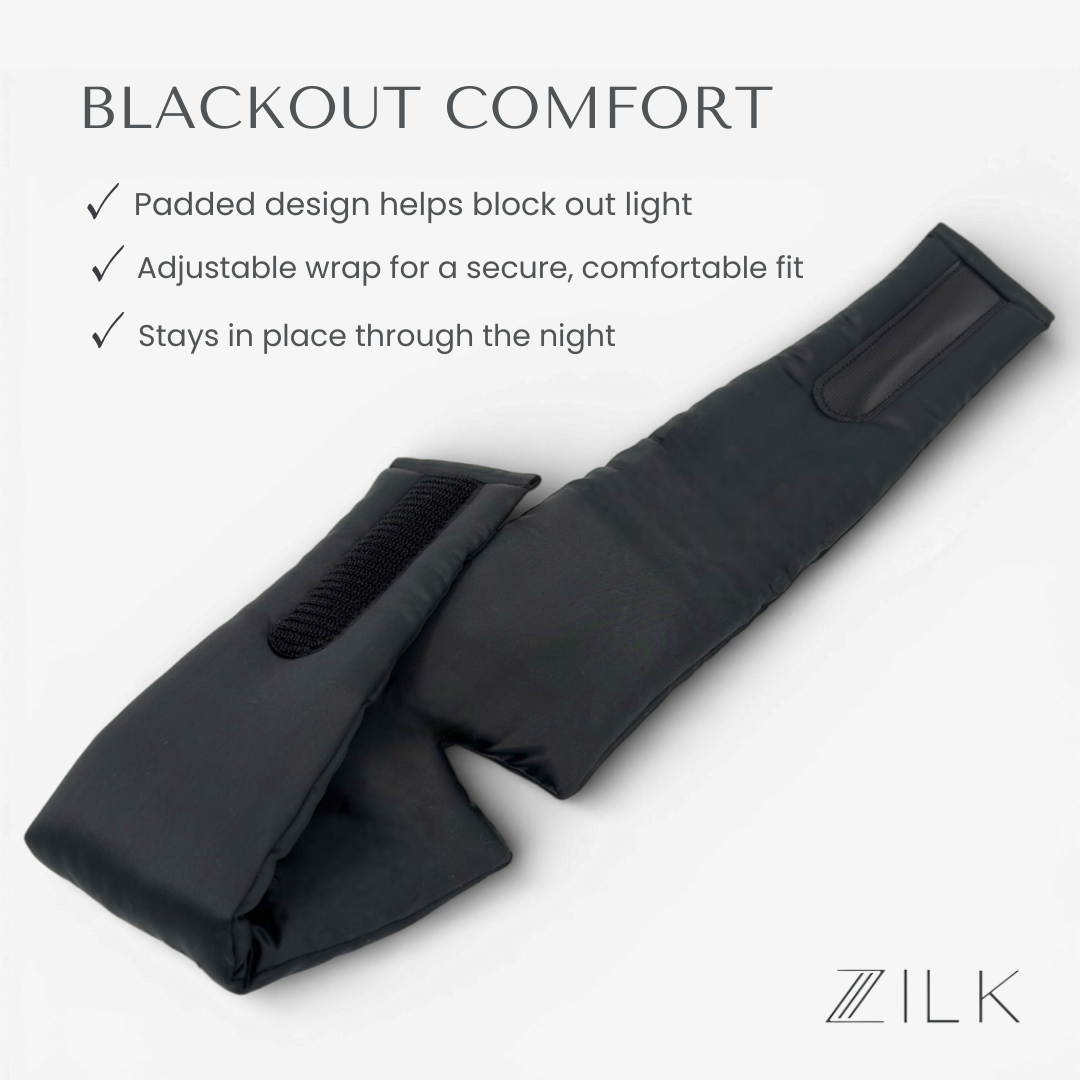 Full blackout, adjustable comfort — silk that soothes, secures, and restores.