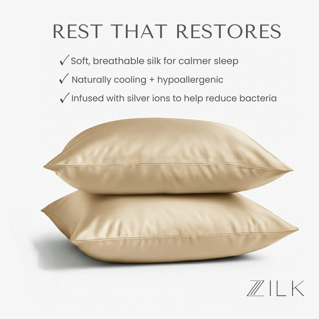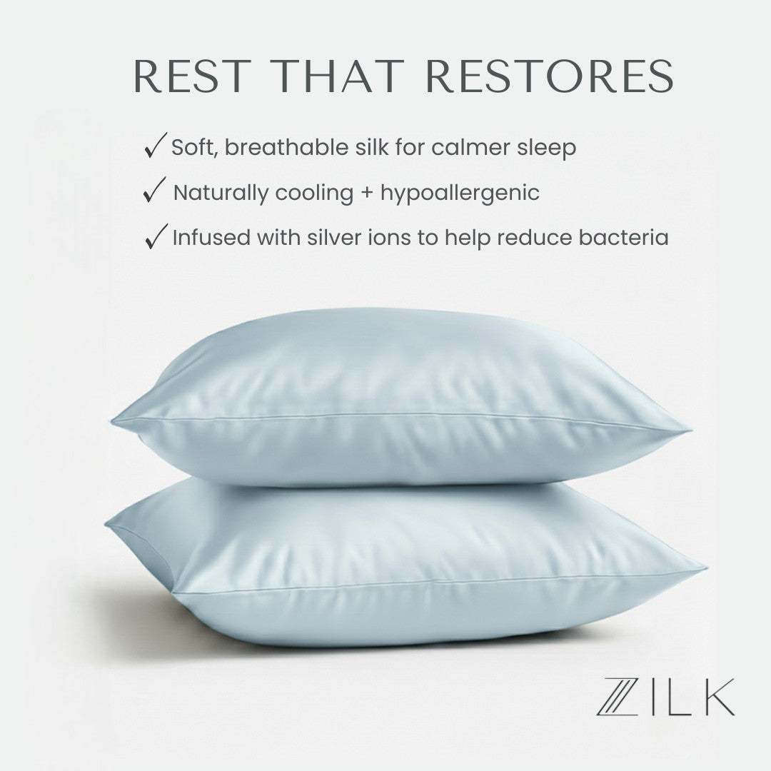 ZILK silk pillowcases, crafted with NeuroSilk™, are designed to help interrupt the stress loop and support a true reset for body and mind. The smooth, cooling surface delivers calming sensory cues, signaling your nervous system it’s time to slow down.