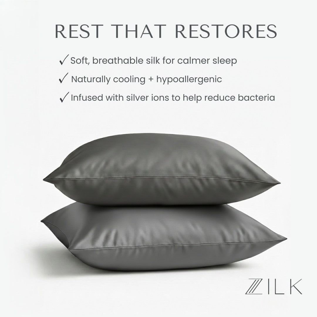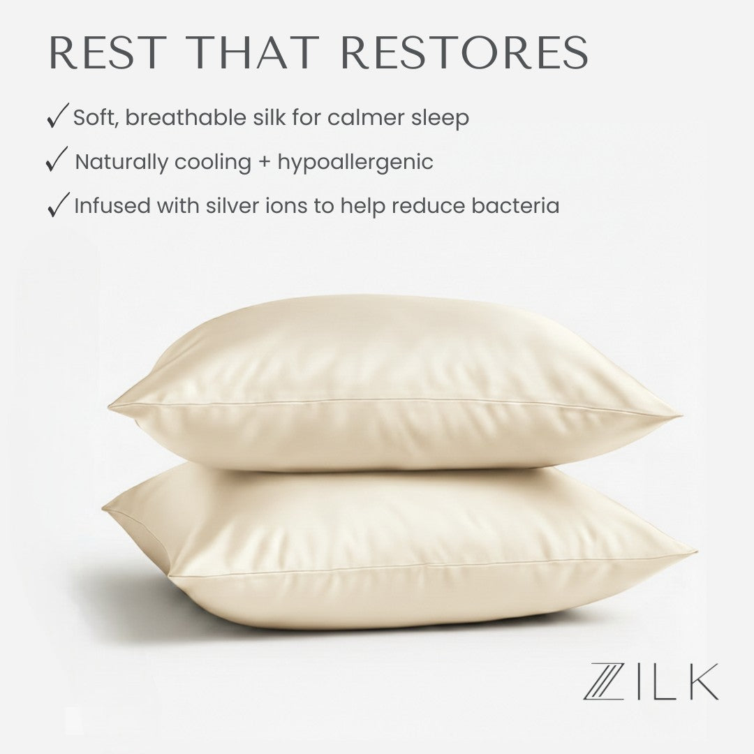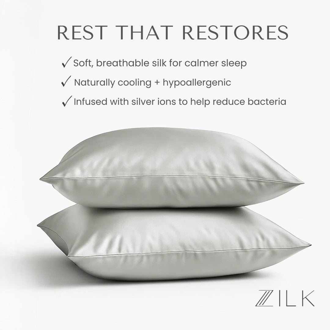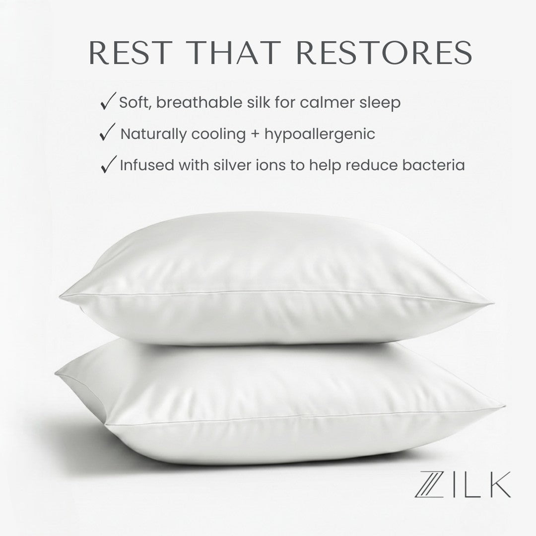 Each ZILK product is designed to bring balance back to body, mind, and beauty. Our silver-ion–infused Mulberry silk doesn’t just protect skin and hair—it transforms rest into a nightly ritual of calm.