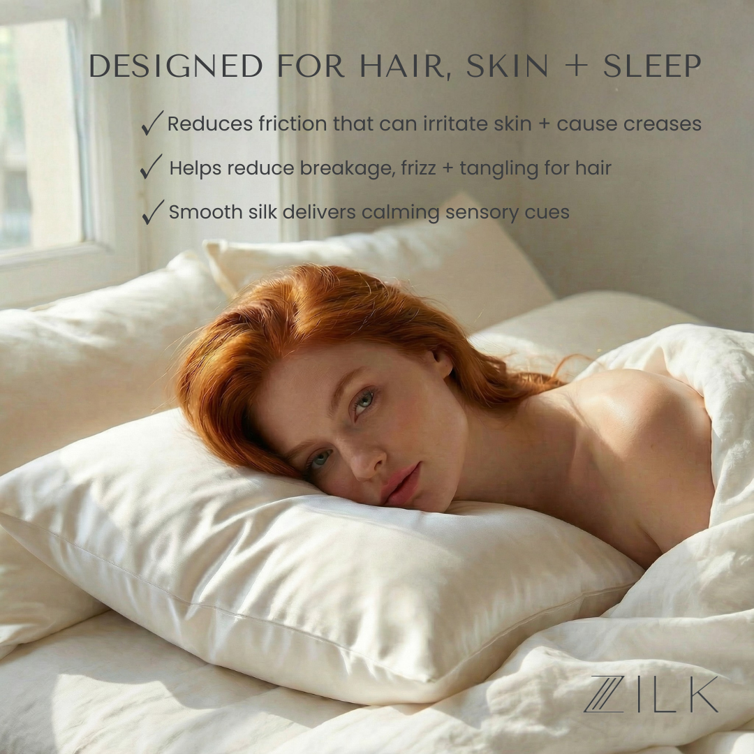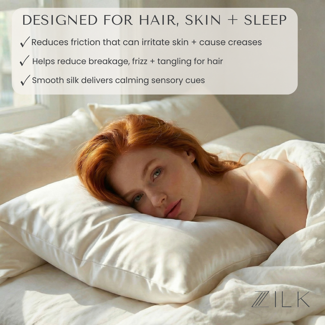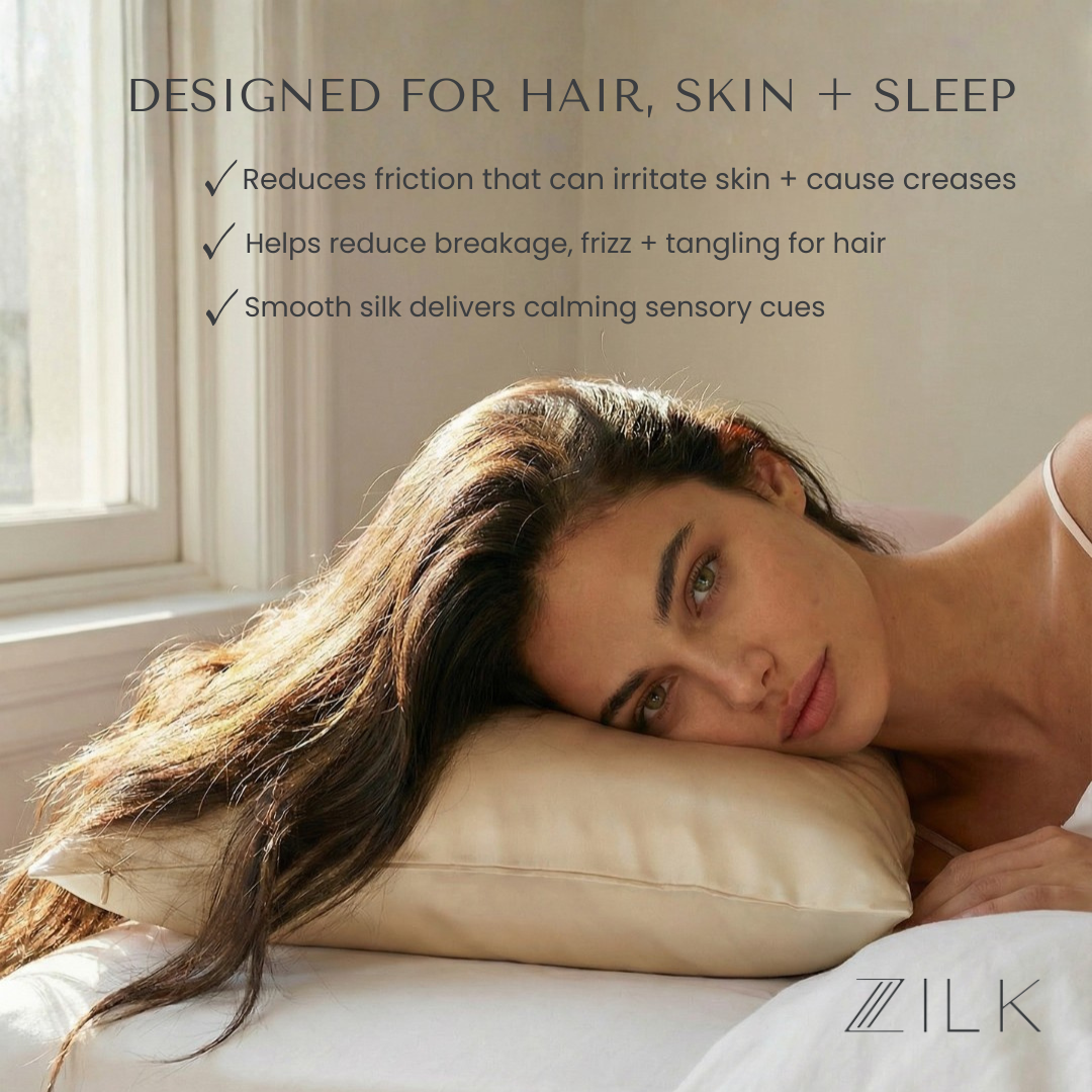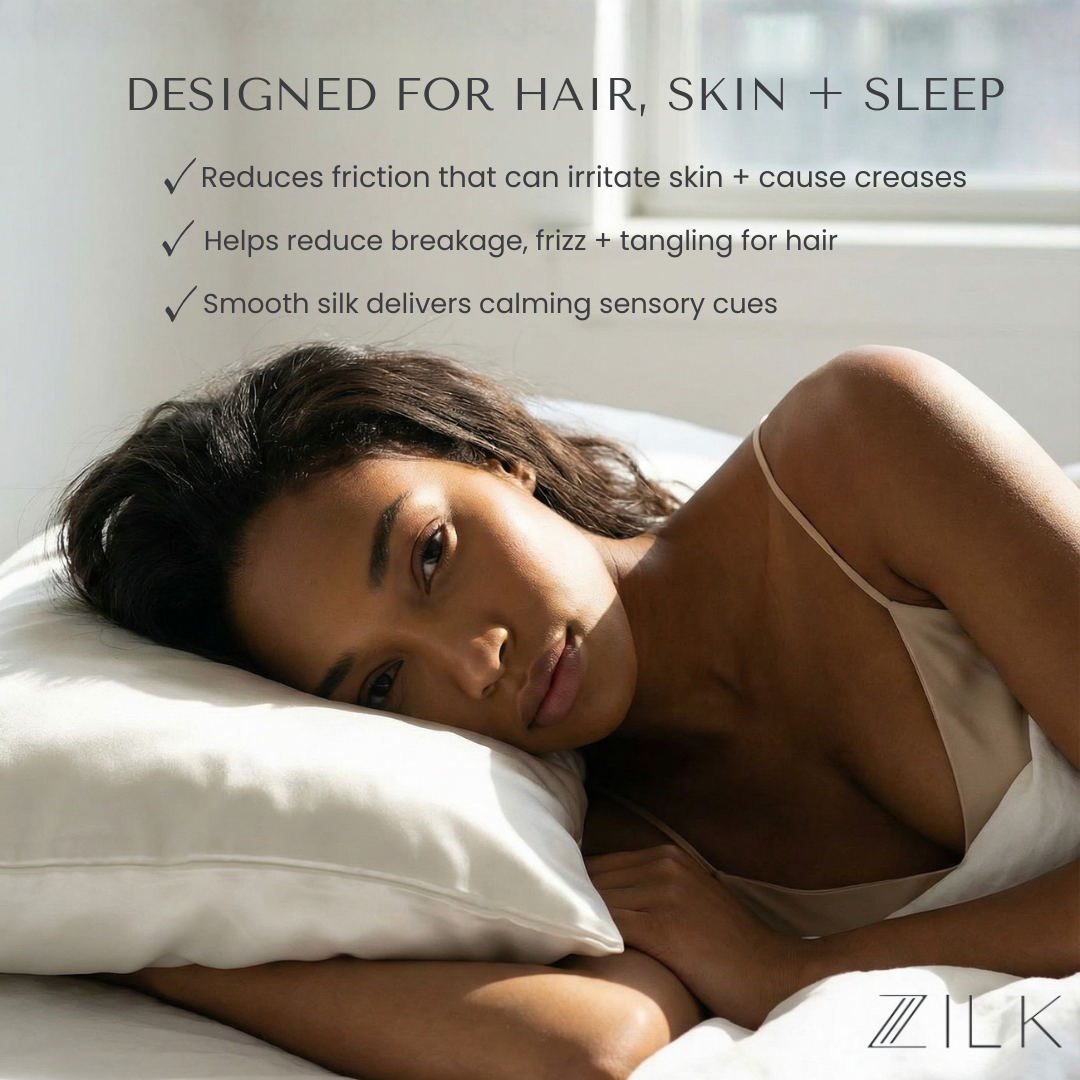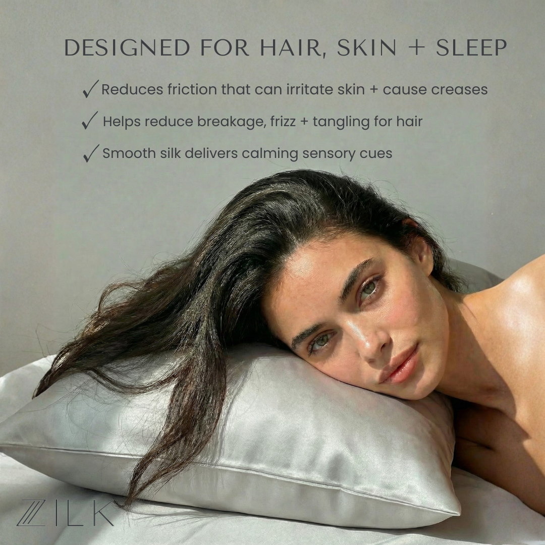 Cotton, satin and synthetic blends absorb oils, skincare products and moisture while creating friction that leads to sleep creases, irritation, hair breakage and frizz. ZILK’s ultra-smooth silk resists absorption and reduces friction, helping skin stay clearer and hair healthier with fewer tangles.